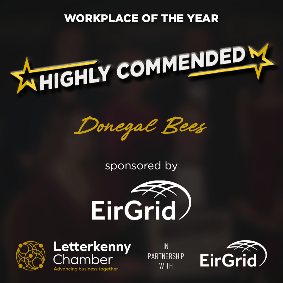 Donegal Bees are delighted to have won the Donegal Enterprise Green Award 2022. The Green Award is in recognition of sustainability intelligence, leadership and innovation in best green practice in Donegal, awarded by Local Enterprise Office.